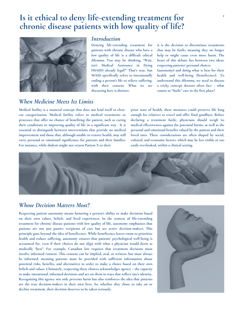Denying life-extending treatment for patients with chronic disease who have a low quality of life is a difficult ethical dilemma. You may be thinking, “Wait, isn’t Medical Assistance in Dying (MAID) already legal?” That’s true, but MAID specifically refers to intentionally ending a person’s life to relieve suffering, with their consent. What we are discussing here is distinct: it is the decision to discontinue treatments that may be futile, meaning they no longer help or might cause even more harm. The heart of this debate lies between two ideas: respecting patients’ personal choices (autonomy) and doing what is best for their health and well-being (beneficence). To understand this dilemma, we need to discuss a tricky concept doctors often face – what counts as “futile” care in the first place?