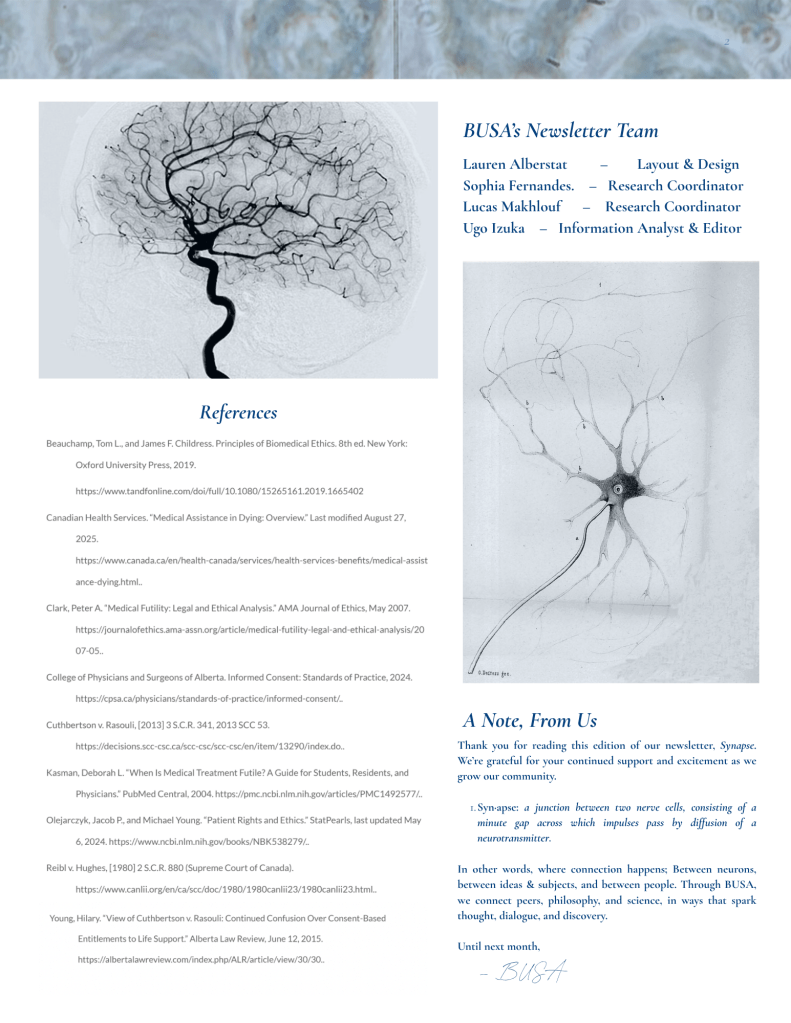 treatment, ruling that physicians must obtain consent before withdrawing life- sustaining treatment, such as mechanical ventilation. Justice Himel in Rasolui — the current presiding case on informed consent in Canada — says that a “plan of treatment” includes withdrawing treatment. She reasoned that because “treatment” covers anything done for a preventative or therapeutic purpose, and because withdrawing treatment can sometimes serve as a preventative purpose, it falls under the legal definition of treatment. In Ontario, if consent by the patient or proxy decision maker is not given, but a physician believes further treatment is futile, they may apply to the Ontario Consent and Capacity Board, which has the authority to determine if the treatment can be withdrawn. However, this reasoning does not provide an answer to our dilemma. Outside of Ontario, there is still uncertainty about how this ruling is applied in practice. Healthcare law is primarily dictated provincially, with not every province and territory having a Consent and Capacity Board. Other provinces may heavily rely on the courts for this decision-making. It is clear that the Canadian legal system has so far failed to create a clear, nationally applied framework for who makes these critical decisions. The cross-province differences open the door to future appeals, keeping alive the ethical and legal debate over who has the authority to withdraw care – the patient, the physician, the consent board, or the courts.