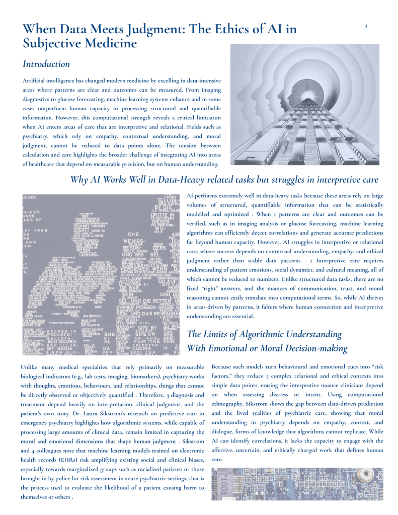 However, this computational strength reveals a critical limitation when AI enters areas of care that are interpretive and relational. Fields such as psychiatry, which rely on empathy, contextual understanding, and moral judgment, cannot be reduced to data points alone.
