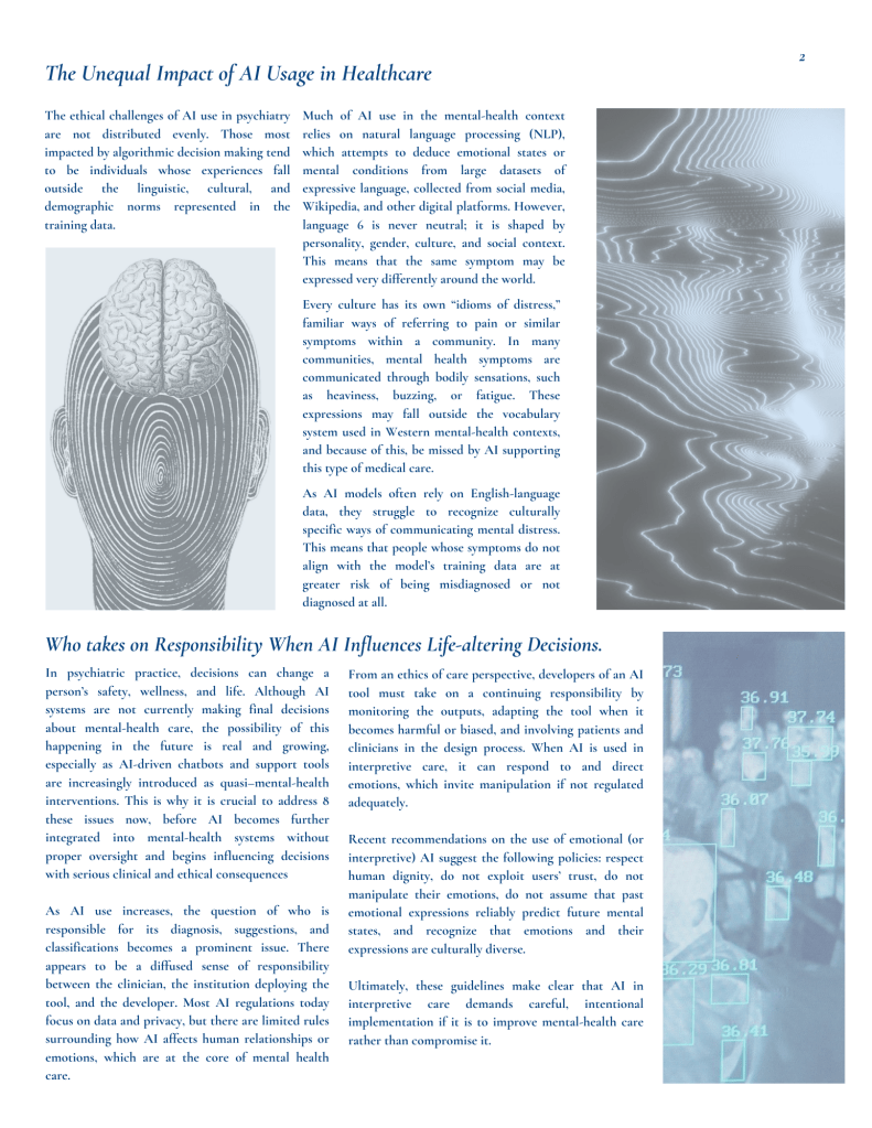 In psychiatric practice, decisions can change a person’s safety, wellness, and life. Although AI systems are not currently making final decisions about mental-health care, the possibility of this happening in the future is real and growing, especially as AI-driven chatbots and support tools are 8