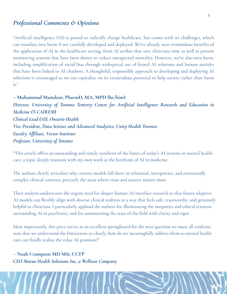 “This article offers an outstanding and timely synthesis of the limits of today’s AI systems in mental health care, a topic deeply resonant with my own work at the forefront of AI in medicine. The authors clearly articulate why current models fall short in relational, interpretive, and emotionally complex clinical contexts, precisely the areas where trust and nuance matter most. Their analysis underscores the urgent need for deeper human-AI interface research so that future adaptive AI models can flexibly align with diverse clinical realities in a way that feels safe, trustworthy, and genuinely helpful to clinicians.