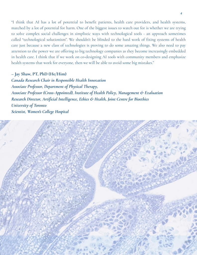 “I think that AI has a lot of potential to benefit patients, health care providers, and health systems, matched by a lot of potential for harm. One of the biggest issues to watch out for is whether we are trying to solve complex social challenges in simplistic ways with technological tools – an approach sometimes called “technological solutionism”. We shouldn’t be blinded to the hard work of fixing systems of health care just because a new class of technologies is proving to do some amazing things. We also need to pay attention to the power we are offering to big technology companies as they become increasingly embedded in health care. I think that if we work on co-designing AI tools with community members and emphasize health systems that work for everyone, then we will be able to avoid some big mistakes.”