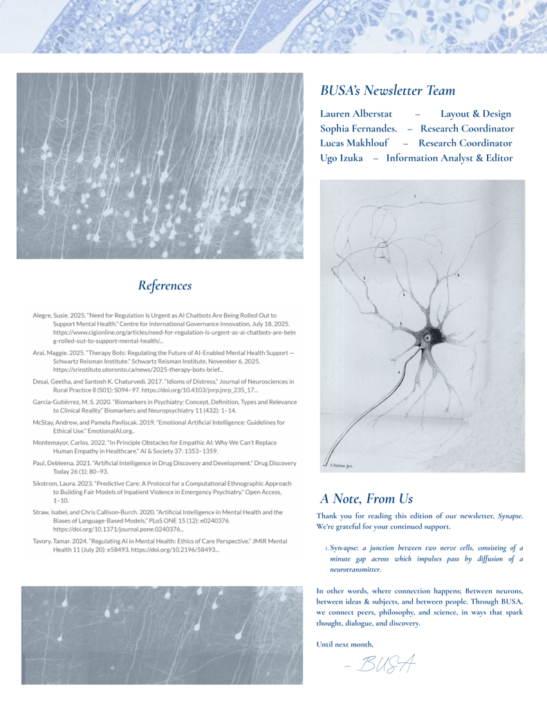 Arai, Maggie. 2025. “Therapy Bots: Regulating the Future of AI-Enabled Mental Health Support — Schwartz Reisman Institute.” Schwartz Reisman Institute, November 6, 2025. https://srinstitute.utoronto.ca/news/2025-therapy-bots-brief…