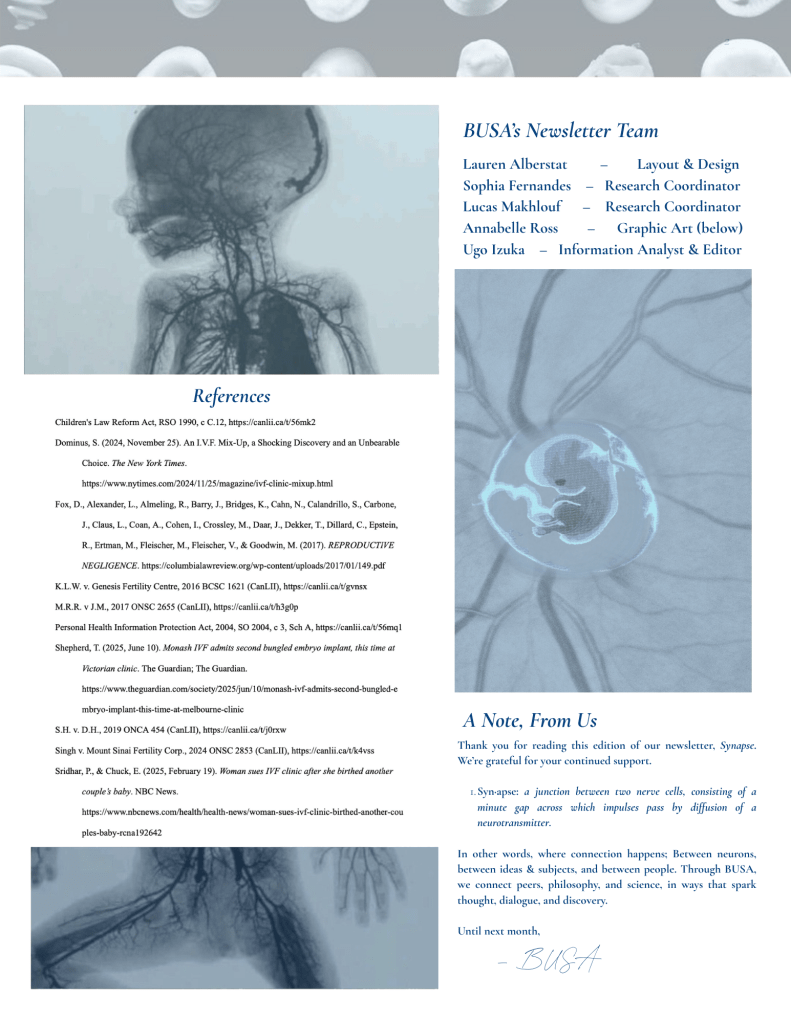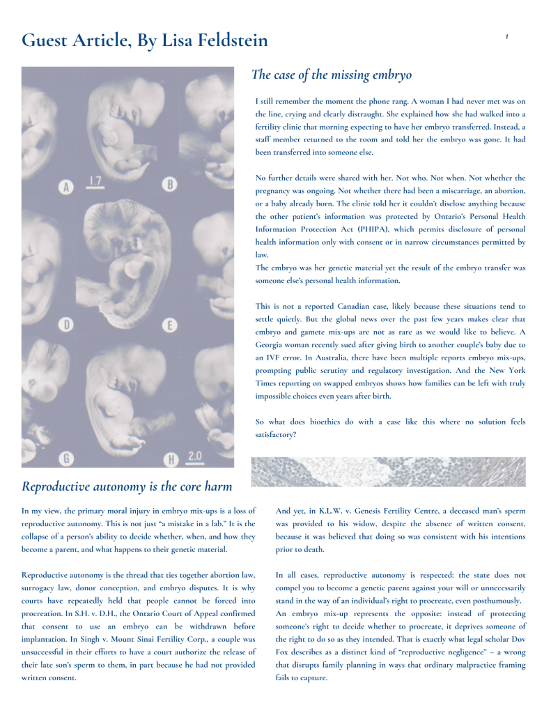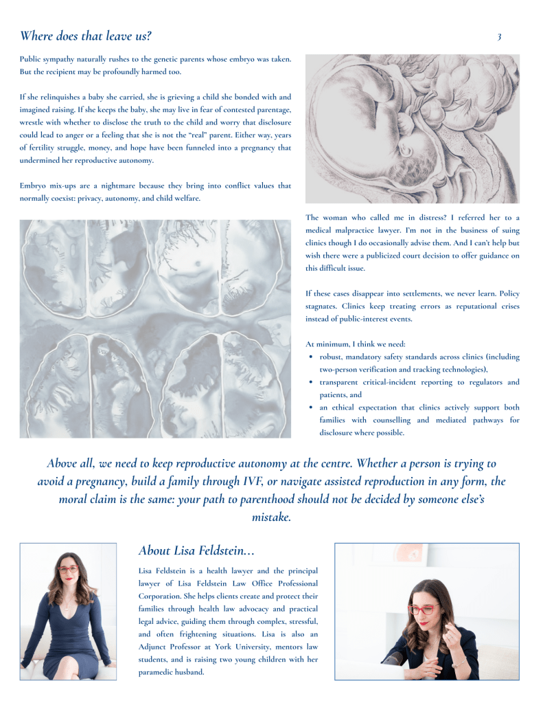 This is not a reported Canadian case, likely because these situations tend to settle quietly. But the global news over the past few years makes clear that embryo and gamete mix-ups are not as rare as we would like to believe. A Georgia woman recently sued after giving birth to another couple’s baby due to an IVF error. In Australia, there have been multiple reports embryo mix-ups, prompting public scrutiny and regulatory investigation. And the New York Times reporting on swapped embryos shows how families can be left with truly impossible choices even years after birth.