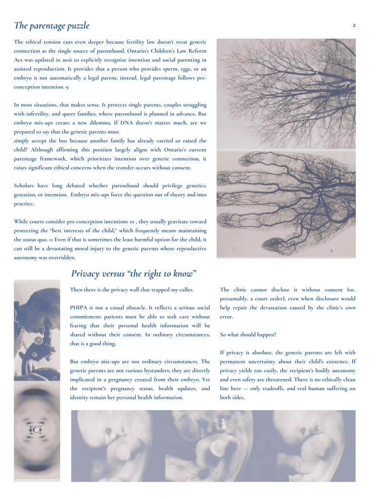 In most situations, that makes sense. It protects single parents, couples struggling with infertility, and queer families, where parenthood is planned in advance. But embryo mix-ups create a new dilemma. If DNA doesn’t matter much, are we prepared to say that the genetic parents must simply accept the loss because another family has already carried or raised the child? Although affirming this position largely aligns with Ontario’s current parentage framework, which prioritizes intention over genetic connection, it raises significant ethical concerns when the transfer occurs without consent.