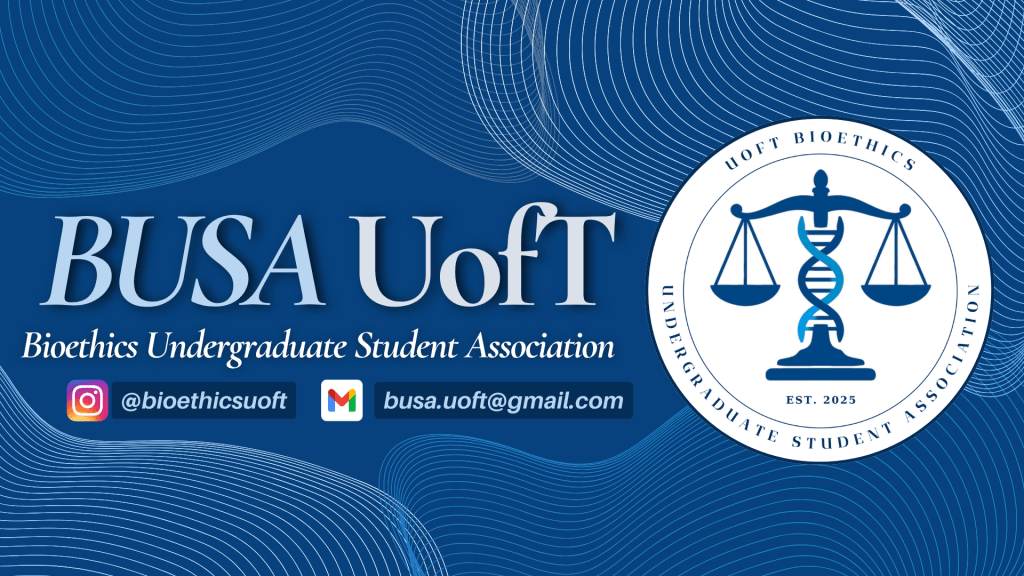 The University of Toronto Bioethics Undergraduate Student Association (BUSA) exists to create a space where students from any discipline can come together to engage with the big ethical questions shaping health care, science, and society. Our goal is to make bioethics accessible, relevant, and collaborative, whether it is through academic events, professional panels, debate sessions, or casual conversations. By connecting students with each other and with leading professionals in the field, we aim to build a community that not only learns about bioethics but also applies it to real-world challenges and careers. Ultimately, BUSA is about giving undergraduates the tools, knowledge, and networks to think critically, act responsibly, and contribute to the ethical conversations that define our time.